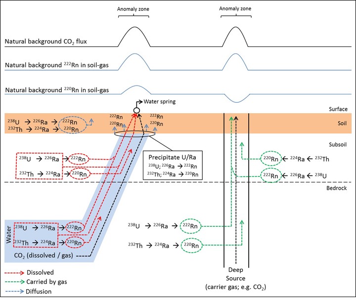 CO2 flux as high as 5000 g m−2 d−1 and 222Rn activities up to 430 kBq m−3 were measured; 220Rn activities were one order of magnitude lower than those of 222Rn. The 222Rn/220Rn ratios were used to constrain the source of the Campo de Calatrava soil gases since a positive correlation between radon isotopic ratios and CO2 fluxes was observed. Thus, in agreement with previous studies, our results indicate a deep mantle-related origin of CO2 for both free and soil gases, suggesting that carbon dioxide is an efficient carrier for Rn. Furthermore, it was ascertained that the increase of 222Rn in the soil gases was likely produced by two main processes: (i) direct transport by a carrier gas, i.e., CO2 and (ii) generation at shallow level due to the presence of relatively high concentrations of dissolved U and Ra in the thermal aquifer of Campo de Calatrava.